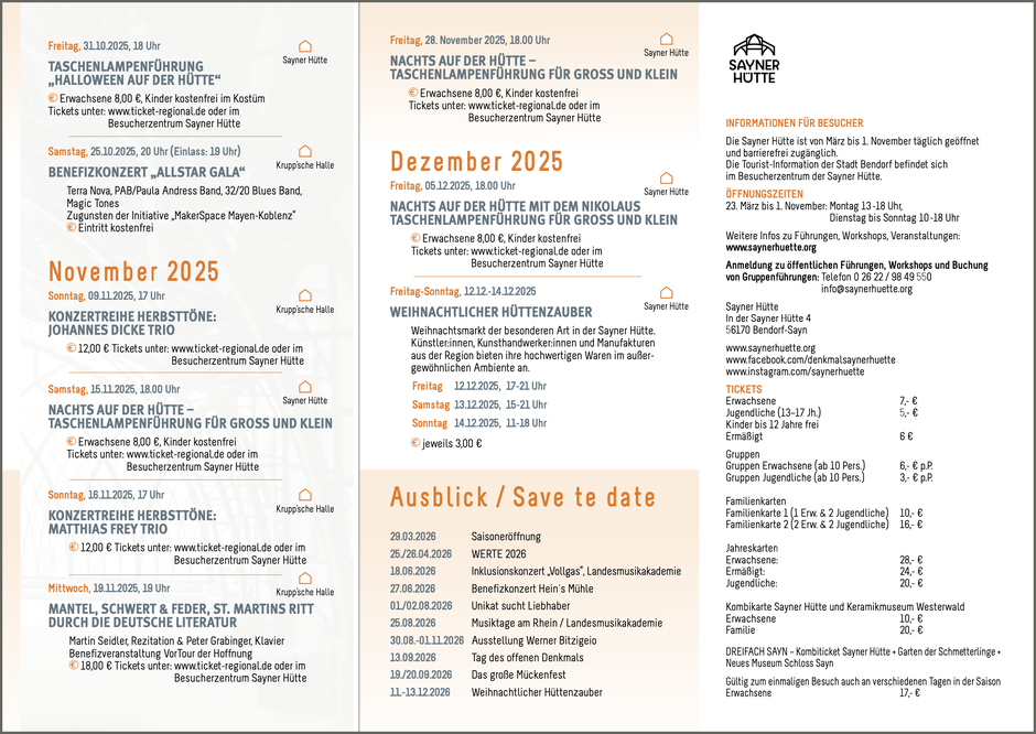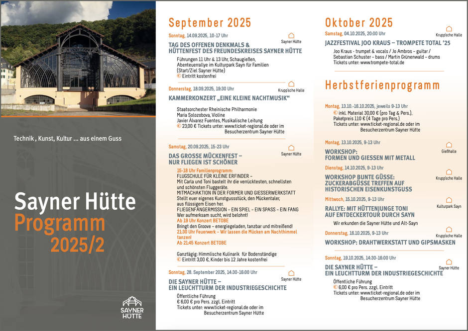 Damit bieten sich unseren Gästen neben den musealen Bereichen mit Augmented Reality, Dauerausstellungen und Inszenierungen mit Licht und Ton auch verschiedenste kulturelle Veranstaltungen wie Konzerte, Messen und Ausstellungen. Von jung bis alt bietet die Sayner Hütte ein vielfältiges Vermittlungsprogramm; von Führungen über kreative Workshops bis hin zu Actionprogrammen – so wird jeder Ausflug ein Erlebnis auf diesem Industriedenkmal von Weltrang.